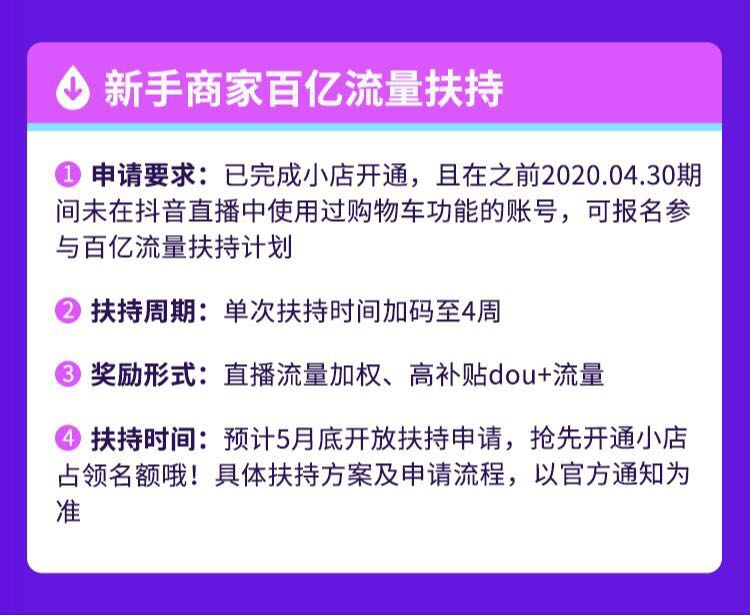 同时,对于已经完成抖音小店开通,且在2020年4月30日之前,没有在抖音直播间使用过购物车功能的账号,还可报名参加百亿流量扶持计划 。